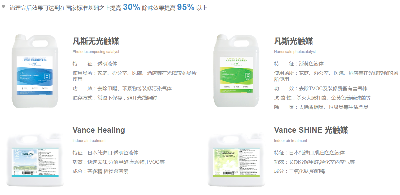 1、針對乳膠漆墻面和石膏板天花板面噴涂國際先進除醛技術的納米光觸媒(5納米可見光催化,產地:日本),在有光的情況下,甲醛被分解為二氧化碳和水,避免二次污染,具有驅除室內有害氣體、抑制和殺除有害細菌、凈化空氣、防霉自潔。針對油性漆頂部噴涂甲殼素除甲醛異味處理劑。